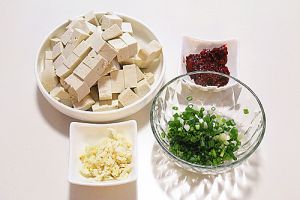 将豆腐切成小块、蒜切末、香葱切碎、郫县豆瓣酱剁碎备用。