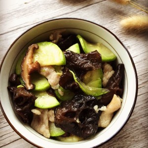 把翻炒好的黑木耳和香菇一起放锅里,锅里加一点热水,盖上锅盖,把西葫芦闷软。此处若加了肉片会变老。