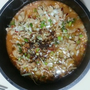 另起一锅,放入适量油,在碗中放入葱花,蒜泥,还有辣椒粉,待油温七八成热时,倒入调料上,OK了!大功告成!
