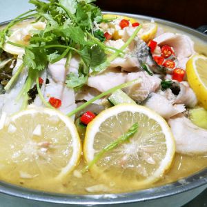 鱼片加适量盐腌制,(有白酒或者料酒也可以加点)淀粉和蛋清抓一下鱼片,放入刚才烫菜的酸菜汤里烫熟,然后整锅倒入刚才垫底的菜里。切片柠檬和小米辣备用。