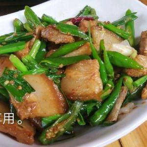 3.加入青椒,青蒜,继续翻炒至青椒入味。