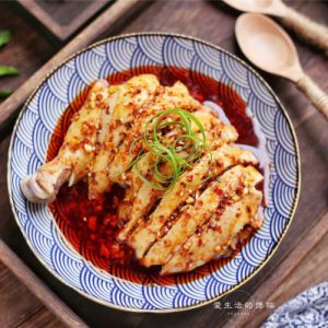 15分钟后,鸡腿蒸熟了,准备好一盆冰水,将鸡肉迅速放入冰水里降温,这一步可以让鸡肉变得更爽口。