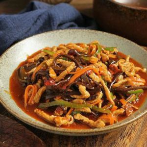 里脊肉 250克、木耳 2朵(大)、青椒 2根、胡萝卜 1根、豆瓣酱 2汤匙、醋 1汤勺、白糖 2茶匙、粉 2茶匙、生抽 1汤匙