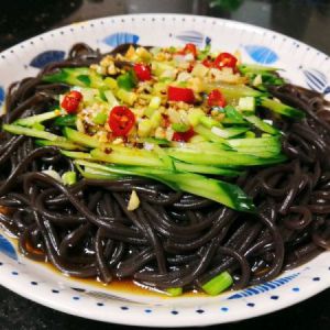 青瓜切丝,蕨根粉上先铺上青瓜丝,再淋上调好的酱汁,撒上葱花,拌匀即可食用。