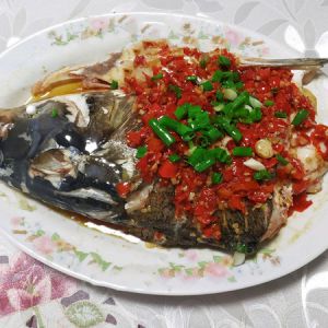 盘子底部垫一些姜片,然后垫上大葱,让鱼跟盘子之间留有空隙,这样易于熟,表面铺上处理好的混合剁椒