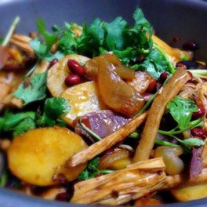 依次放入材食,不易熟的先放,好熟的后放,翻炒均匀,加入料酒炒匀。