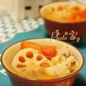 将莲藕和番茄洗净,莲藕去皮,切块。