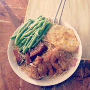 煎蛋,然后煎鸡排,烧鹅,然后用水煮熟豆角,