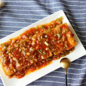 把炒好的酱汁淋在夹了土豆泥的豆腐上,外酥里嫩的,香味浓郁的土豆酿豆腐就做好了。