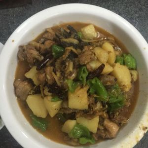锅里加油、油热以后、把干辣椒,八角、花椒,放入锅里、炒一分钟、放入鸡肉,鸡肉颜色炒白以后、放生姜丝,蒜,大葱.生抽、翻炒3分钟后、加水、淹过鸡肉、中火,煮30分钟