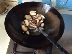 热锅凉油放入肉丝煸炒,放入葱姜料酒,再放入香菇煸炒片刻。