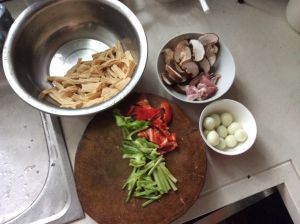 腐竹切段,鹌鹑蛋去売,青红椒切块,川兄切段备用。
