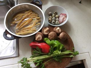 全部食材,腐竹用冷水泡2小时,鹌鹑蛋煮熟备用。