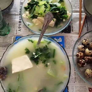鱼煎好后放准备好的热水,末过鱼就好,煮至奶白,下切好的冬瓜至半熟放入切好的盒豆腐继续炖至熟,放入2勺盐一勺胡椒粉,最后放香葱香菜出锅