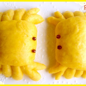 将螃蟹翻转过来,摆好造型,并剪出后腿和蟹钳。每只螃蟹下面垫一张油纸(或蒸锅笼屉上刷一层油防粘),间隔预留大一些。