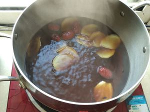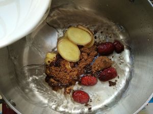 将生姜片、红枣、红糖和清水放进无油的汤锅里,大火煮开。