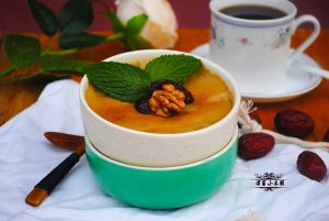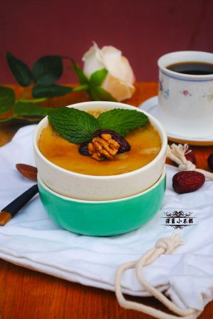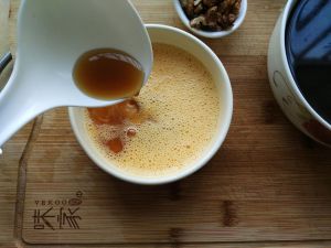 将熬好的红枣姜茶趁热倒入打散的鸡蛋中,搅拌均匀,再将核桃粉也倒入碗里搅拌均匀。