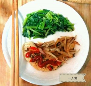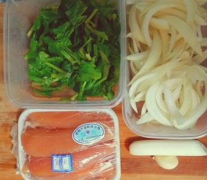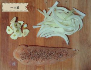 1、菠菜(或其他你喜欢吃的菜*)和洋葱处理好,切成你喜欢的形状(好熟就行!);鸡肉洗净后打上花刀(为了入味,不打行~),撒上盐和黑胡椒碎或胡椒粉腌一会儿