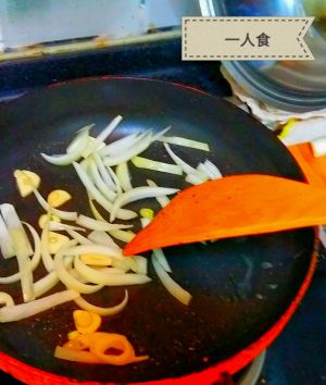 3.先放入葱蒜(不爱吃就不放),再放洋葱炒香(可放少许盐调味)