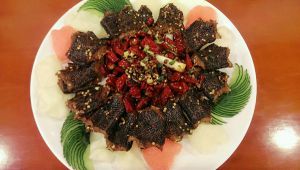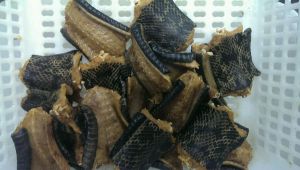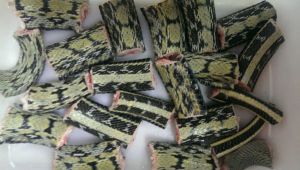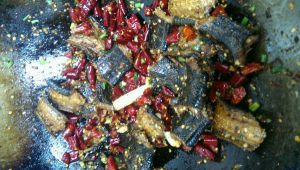 热锅冷油下大葱,姜片,蒜粒,海椒花椒炒香倒入蛇肉翻炒
