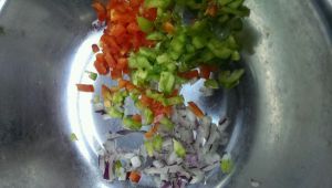 倒入青椒粒,红椒粒,洋葱粒调味鸡精,盐,白糖,胡椒面,海椒面,孜然起锅