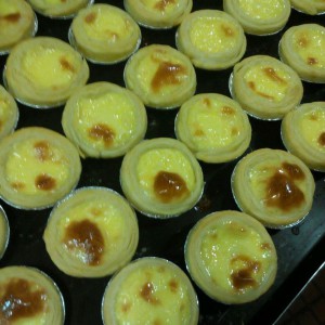 灌入蛋挞壳内,这里的蛋挞壳是现从外面买的,八分满左右。底火230度,面火220度,放入烤箱大概烤二十五分钟左右。