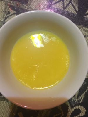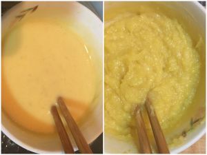 蒸锅加水,烧开,放入蛋糊碗,蒸两分钟后搅拌一下,到第三次的时候就要不停地搅拌了,直至变得浓稠看不见水分,奶黄馅料就做好了。