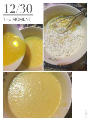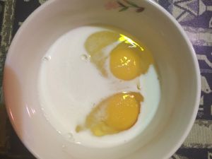 碗里打入鸡蛋,加牛奶、白糖,用打蛋器搅打均匀。