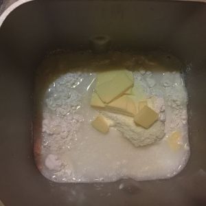 面团所需所有材料称量后放进面包机,用面团功能揉面发酵。如果是自己揉面,那可就麻烦多啦。趁着发面的时间准备奶黄馅料。