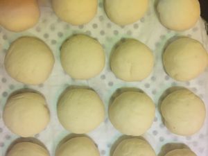 发好的面团取出排气,分成25克左右的剂子,擀圆,放入馅料,收口朝下。