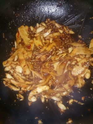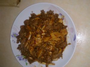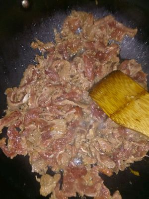 加入豆瓣酱,十三香,胡椒粉,辣椒粉,泡仔姜,老抽!小火慢炒二分钟!加入牛肉,一汤匙老抽!一汤匙生抽,少许盐,,快速翻炒!