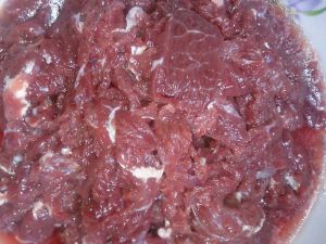 新鲜牛肉洗干净,凉干水,放入料酒,少许盐,腌制备用!