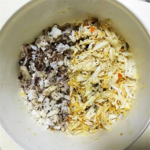拆掏蟹肉。这确实是很费功夫的事,如果足够耐心、掏得彻底,掏出的蟹肉就够装满5个蟹斗,上次熬粥的蟹斗也可以留下来备用哦。这蟹够肥美,拆掏出这么多蟹肉,左边是蟹钳、蟹足里面的肉,右边则是蟹腹中的。