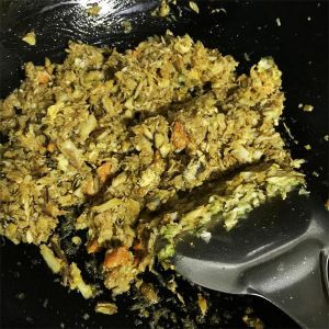 然后下蟹肉,只需加一小勺蒸鱼豉油即可,多加无益,也无需加盐,因为蟹肉本身就已经很鲜美了。翻炒均匀即可关火。