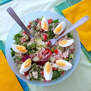 所有配料放入色拉盆,依个人口味淋上色拉酱(个人建议:清爽的油醋色拉调味汁),搅匀,华丽丽滴摆上8瓣白煮蛋。完成,享用吧!