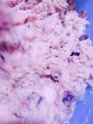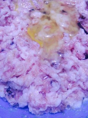 肉混合均匀。和馅料混均匀 揉。加入蛋清