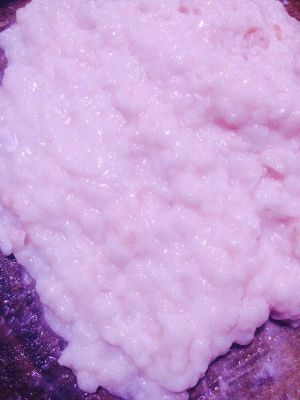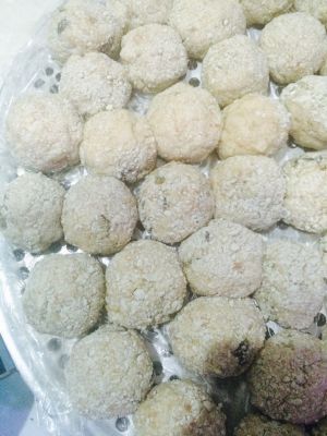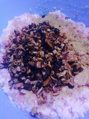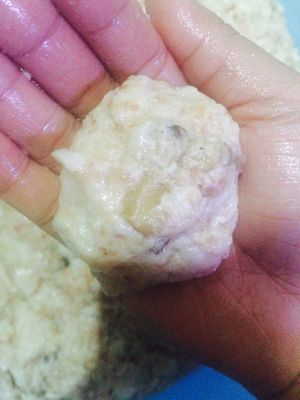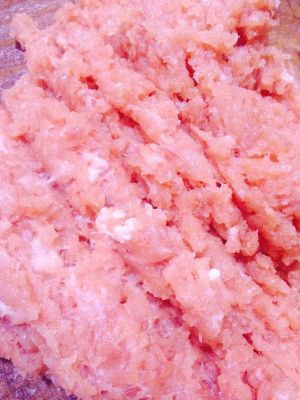 加入蛋清揉啊揉。番薯粉打湿加入肉里继续肉。番薯的量是根据肉的湿度放哦。一点点加哈 揉匀成团就好