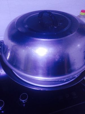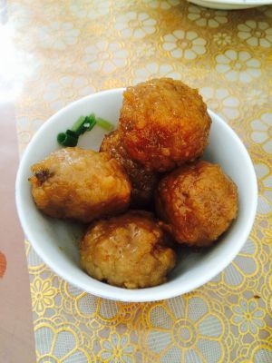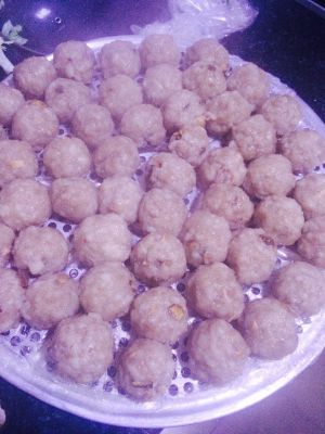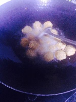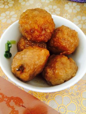 留了一些没炸的来焖。 下油 煸炒肉丸 加入酱油炒一下加点水焖 就可以出炉啦。很香哦。出炉给我吃了五六个