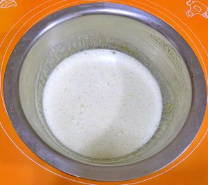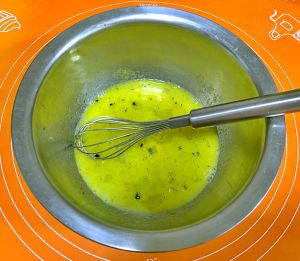将蛋黄糊隔80度热水打发至浓稠发白状态,晾凉备用