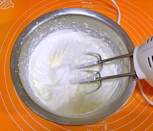 淡奶油加入另一半细砂糖打发至出纹路,打的时候中速转低速,注意不要打过