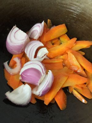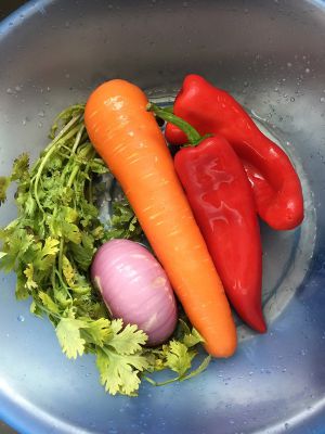 2.把胡萝卜、红椒、洋葱、香菜洗净!