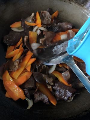 10.待水煮干,放入红椒和酱油,这个时候可以加盐和味精了,继续翻炒!