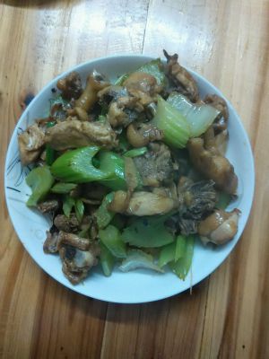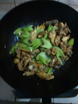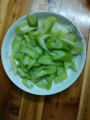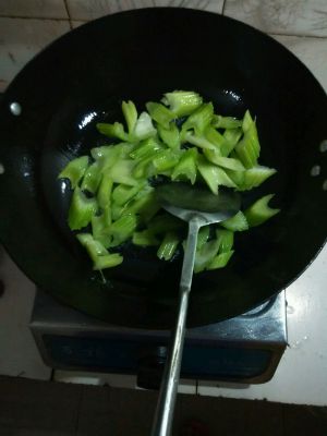 把锅洗干净,放少许油,把西芹炒到变颜色了。