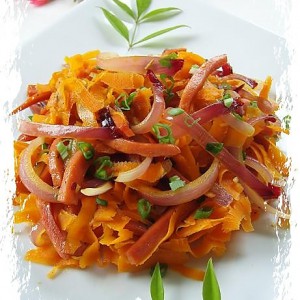 然后倒入刮好的胡萝卜“丝”翻炒片刻;
