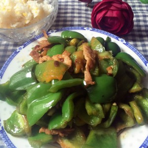 倒入青椒大火翻炒,要一直翻炒不能停,炒至断生,可以适当加点水翻炒,三五分钟出锅即可!