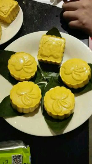 揉好后,分成小球状,用包汤圆的方式,将馅料包入面皮中。我是使用做月饼的模具的,注意要在模具里刷点油,这样方便脱模~将做好的南瓜饼放在洗过的橘叶上。