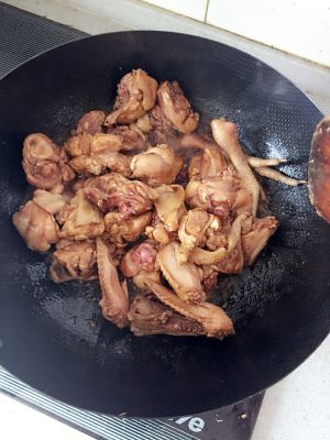 炒锅放油少许,倒入鸡肉翻炒片刻,倒入生抽老抽翻炒均匀上色,放入葱姜蒜,翻炒出香味,撒些白砂糖继续翻炒一会儿,加适量水,以超过鸡肉些许为宜。