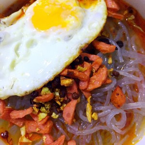 在调料中加入面汤,红薯粉,再加入炸好的蒜末等。放入煎蛋,酸辣粉丝成型!