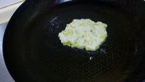 煎约一分钟后,至饼糊底部微黄,翻面。放入第二勺面糊。