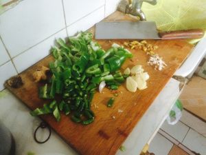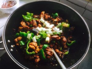 加青椒和葱,翻炒